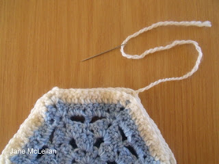 I crochet the white round and then leave a long tail to use to sew it to the previous hexagon. This saves working in two ends.